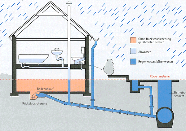 Durch den Einbau entsprechender Rückstausicherungen (Rückstauverschlüsse, Hebeanlagen) wird gewährleistet, dass Einleitstellen unterhalb der Rückstauebene (vorwiegend im Keller eines Hauses befindliche Duschen, Waschmaschinenanschlüsse, Bodeneinläufe etc.) in Hochwassersituationen nicht überflutet werden. Die Vorsorgepflicht besteht auch für auf dem Grundstück befindliche offene Flächen sowie Kellergaragen. Alle manuell gesicherten Abläufe (Rückstauverschluss) sind dauerhaft zu beschildern.